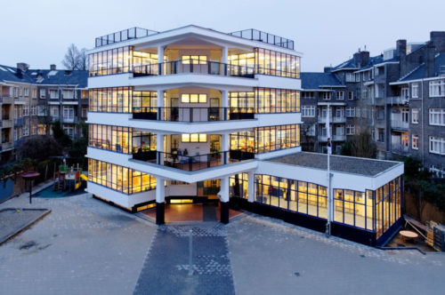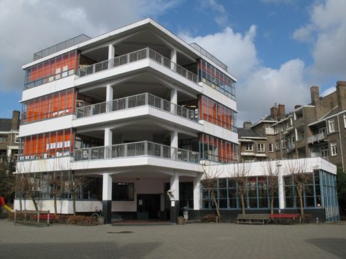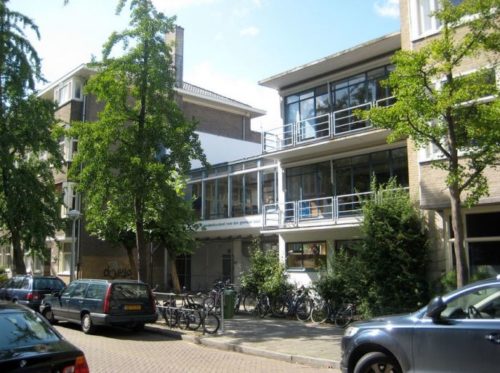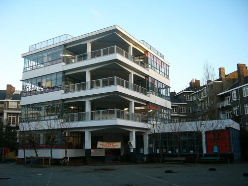 この学校は、オランダのアムステルダム市アムステルダム・ズィッドにあるクリオストラート40番地にあるフラット・ブロックの中庭に建てられた。
