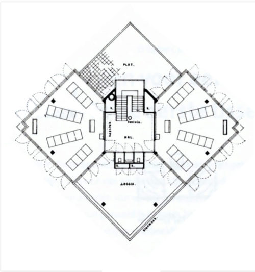 当初、本校舎は7.80×7.80m、高さ3.40mの正方形の教室が7つあり、1階に1つ、3つの上層階にそれぞれ2つずつあった。 教室の壁のうち3面はガラス張りで、黒板を支え、教室の入り口のドアもある4面は、床から天井まで石積みでできている唯一の壁である。 もう一方の素材面は、高さ1.20mの窓がある壁で形成されている。 テラスに通じるガラスドアは幅いっぱいに開く。 各階の小さな廊下と階段の前に、トイレのドアがある。 建物にはテラスがある。