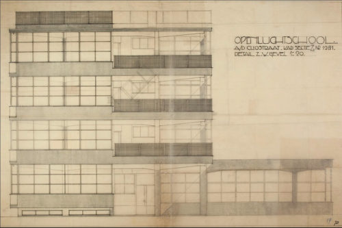 20世紀初頭から、体力のない子供たちが太陽の光と新鮮な空気の助けを借りて体力をつけることができるよう、野外学校が建設されてきた。 1927年、デュイカーと バイフォートは、アムステルダム南部にあるそのような学校の設計を依頼された。 周囲を囲むブロックの中庭に建てられたこの建物は、さまざまな場所に設置される5つの予備設計図に先行されていた。