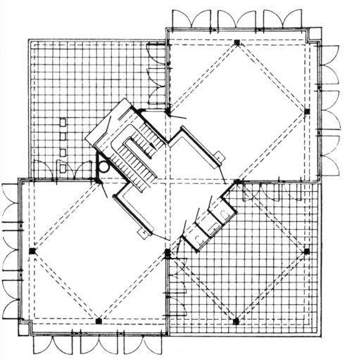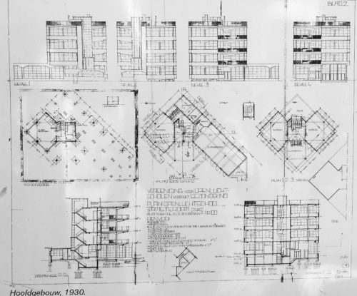このアウトドアスクールのために、デュイカーは 彼は、鉄筋コンクリートの骨組みに格子状の桁(一部は片持ち梁)を使い、寒さが伝わらないように9メートルごとに独立した柱で支え、生徒たちができるだけ長い時間新鮮な空気を楽しめるように、全開できる窓を大きく並べた。 学校は、敷地を挟んで対角線上に位置する、4階建ての教室からなる正方形のブロックで構成されている。 この基本的な間取りは、小ホールを中心に4つの象限に細分化され、その1つの上に中央の斜めの階段がある。 東と西の四分円には各フロアに1つの教室があり、南側にはテラスまたは屋外教室がある。 階は北側がスタッフルーム、西側が教室、そしてオープンテラスの下にメインエントランスがある。 体育館は教室棟の下に設置され、必要な高さまで沈められた。