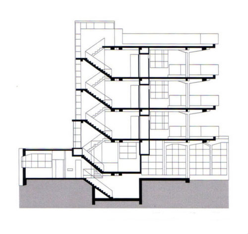 構造体の力分布は、柱と梁を通して示される。 低いコンクリートの欄干を除き、ファサードは全面ガラス張りで、教室を全開にできるスチールフレームの回転窓が設置されている。 コンクリート床スラブの底部にはセントラルヒーティングのパイプがあり、打設中に設置される。