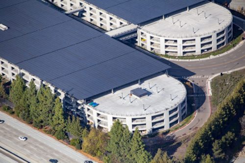 14,000人の従業員と訪問者のために、アップルは数台の駐車スペースを建設した。 多くの車は本館の下にあるが、ほとんどはキャンパスの南側にある2つの巨大なガレージに詰め込まれている。 新本社は合計で31万8000平方メートルのオフィスと研究所のスペースを持つ。 駐車場の面積は32万5000平方メートル。