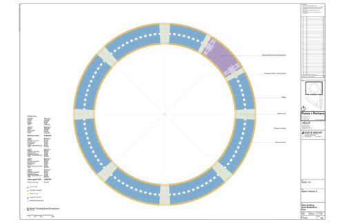 最終的な建物の構成は、外半径464m、リング幅約54,86mとなる。 このリングは放射状に104のセクタに分かれており、それぞれの内角は約3.46度である。 これらの放射状のセクターは、7つの入り口とカフェテリア・レストランで区切られた9つの放射状の棟にグループ分けされている。