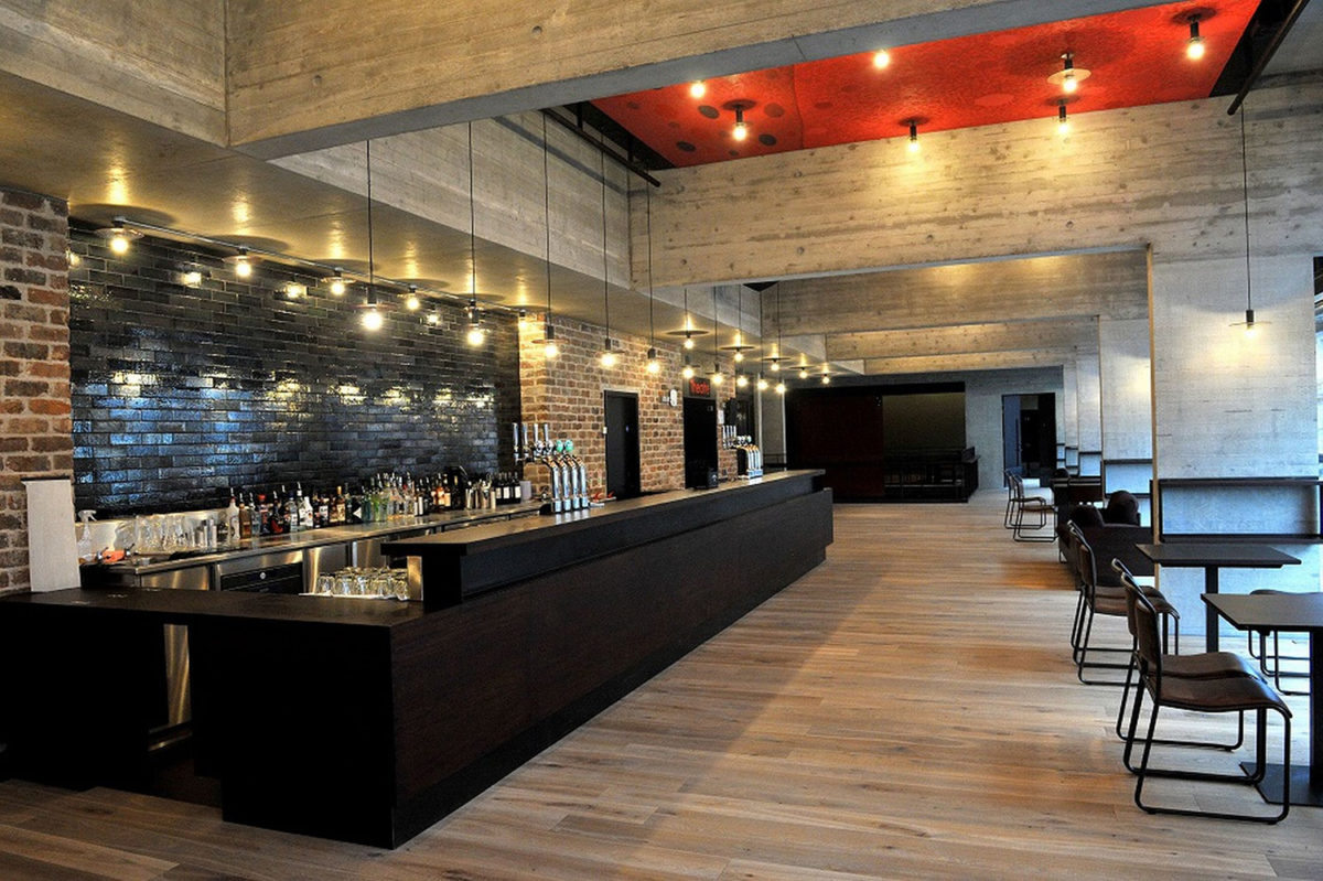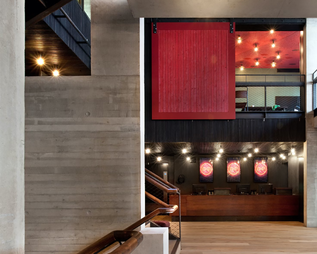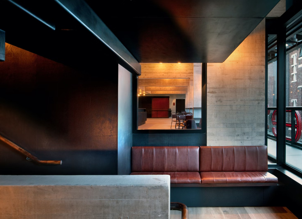 アーティストのアントニ・マリノフスキーがメインロビーの天井にペイントを施し、再生レンガ、黒いスチール、再生オーク材とイロコ材、色彩豊かな合板、淡いコンクリート打ちっぱなしなど、公共エリアと敷地裏手に広がる内部パレットを引き立てている。
