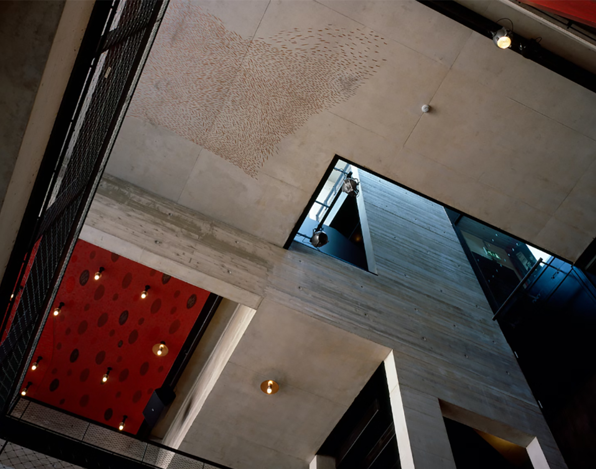 これらのスペースは、3つの階層に分かれた回廊を中心に配置され、複雑なジオメトリーで織り成され、講堂を頂点に、地下のビストロ、ストリートカフェ、1階のバー、作家の部屋、コミュニティーの学習スペースなどを提供している。