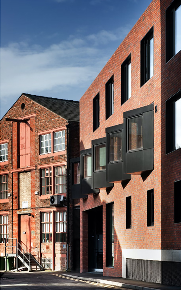 外壁に地元の赤レンガを使用し、4本の大きな換気用煙突が特徴的なシルエットを与えると同時に、周囲の建築と一体化している。