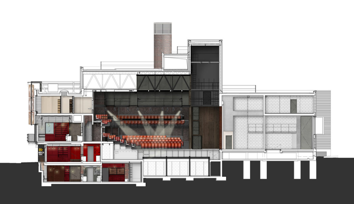 新しいエブリマンシアターでは、元の劇場の古い資材の90%が使用されている。 外壁と4つの大きな換気煙突には、地元の赤レンガが選ばれた。