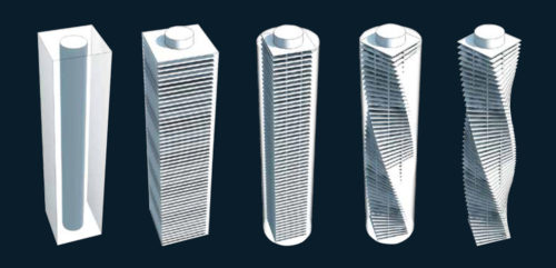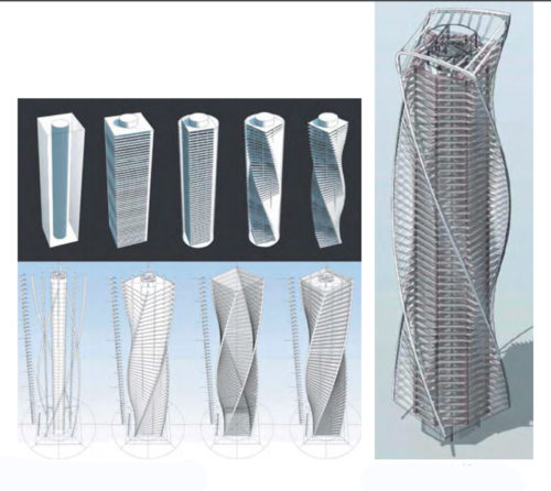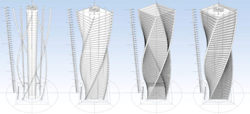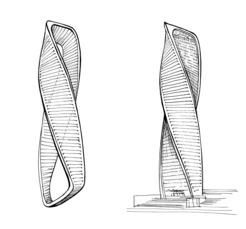 彫刻のように回転したタワーはDNA分子に似ており、2つの対向するファサードのリボンがねじれ、滑らかに組み合わさって屋上の金属構造になっている。