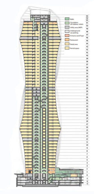 シンプルで革新的なデザインは、正方形のコンクリート床スラブと垂直構造RCフレームというねじれの原理に基づいており、中央のコアと連続梁を持つ8本の柱、そしてコーナーにある4本のらせん状の柱によって支えられている。