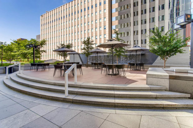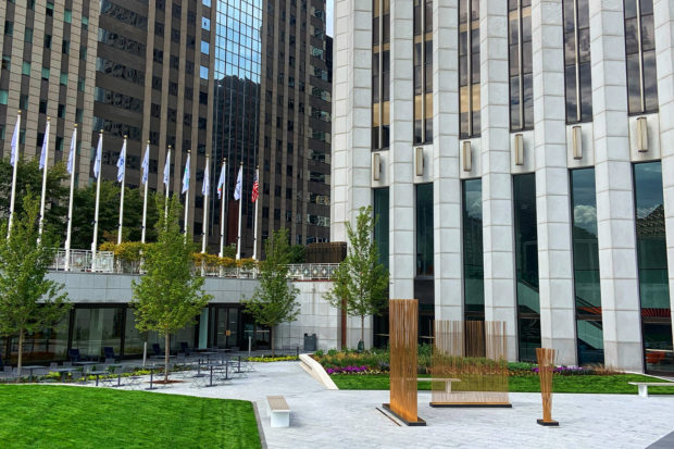 景観は、建物の東側と西側に旗竿で縁取られた高くなった歩道で構成され、建物のメインエントランスには、改良された歩行者用エントランス、北側の車道、南側のサンクンプラザがある。 換気ダクトを隠した長さ55メートルの滝は、広場に接するプールに落ちる。