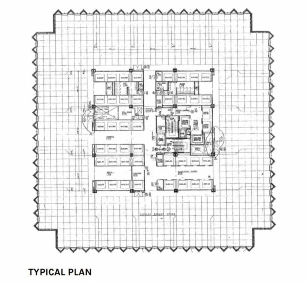 エレベーターやその他のサービスはコアに集められ、外周の柱が外側のチューブを構成する。 タワーには50基のエレベーターがあり、そのうちの何基かはダブル・プラットフォームになっている。 内管と外管はトラスで結合され、大きく開いた床スラブを支えている。 フロア間の高さは3.86m。