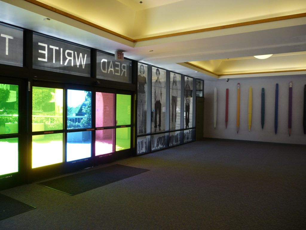 図書館の入り口には、ステンドグラスにプリントされたジョン・バルデッサリの作品『READ – WRITE – THINK – DREAM』がある。 ガイゼル図書館には、スース博士の最も有名なキャラクターである「帽子をかぶった猫」の等身大ブロンズ像もある。
