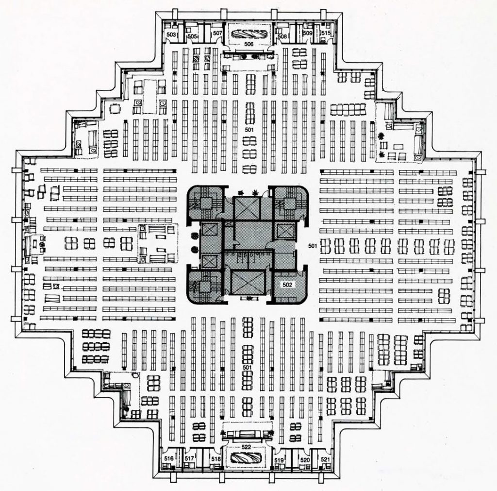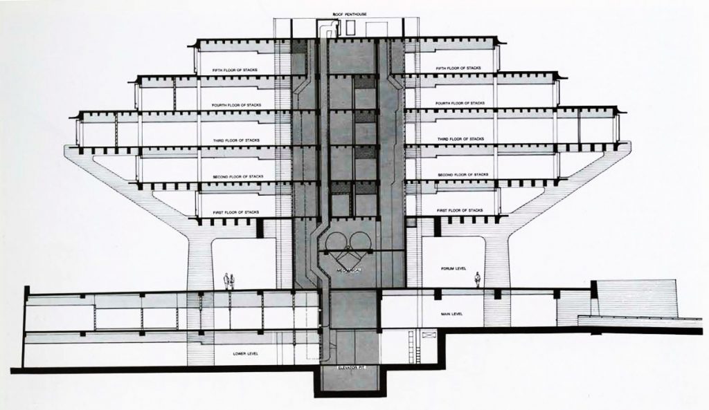 コレクション、1995年の修復から復元された個人学習スペース、グループ学習室がある上階6階のキャンティレバーは、屋外広場に影を落としている。 この6つのフロアはそれぞれ大きさが異なり、6階は幅64mと最も大きい。