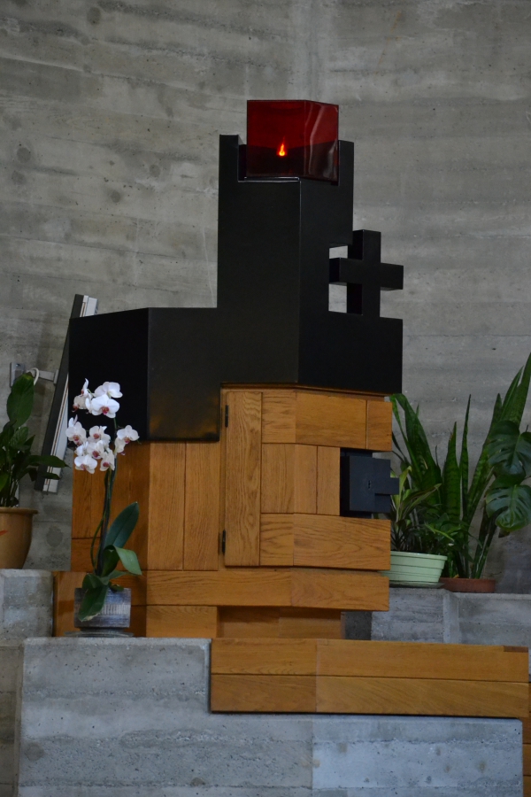 この山村のために、彫刻家はこの場所に落ちた岩を想像し、そこに教会を彫り込んだ。 この建物はモダニズムの原則をほんの少し採用しているが、ポスト機能主義への関心を示している。 この建物は、木とコンクリート、光、宗教的・世俗的な機能性を組み合わせた、彫刻と建築の融合である。