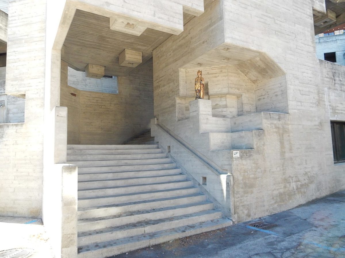 この教会は、強烈なモニュメントのような存在感で、地形の突然の変化に適応している。 塔のような鐘楼に見守られながら、斜面に張り付くように、階段や遊歩道が連なっている。 角ばった開口部が穿たれた複雑な形は、まさにコンクリートの彫刻だ。