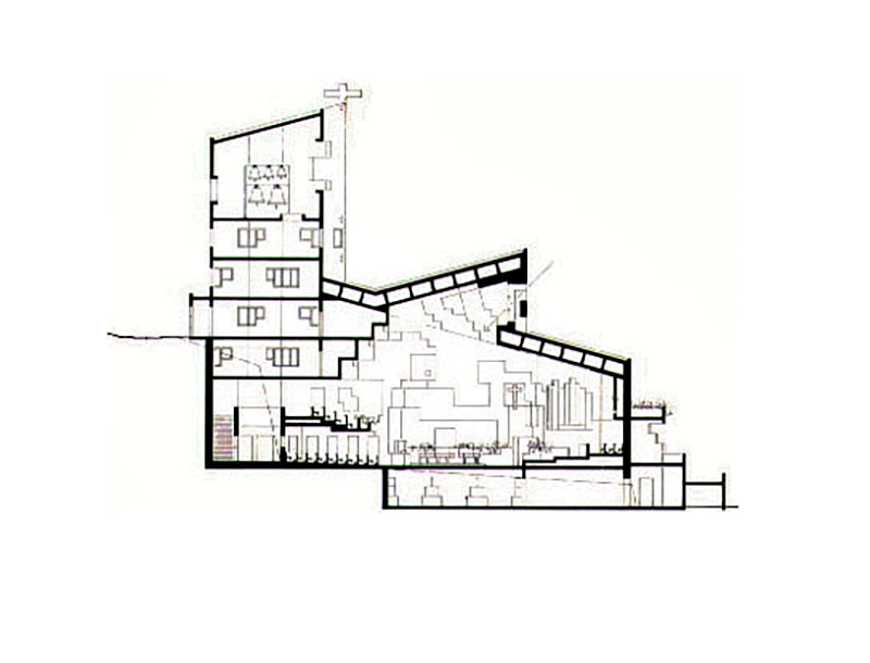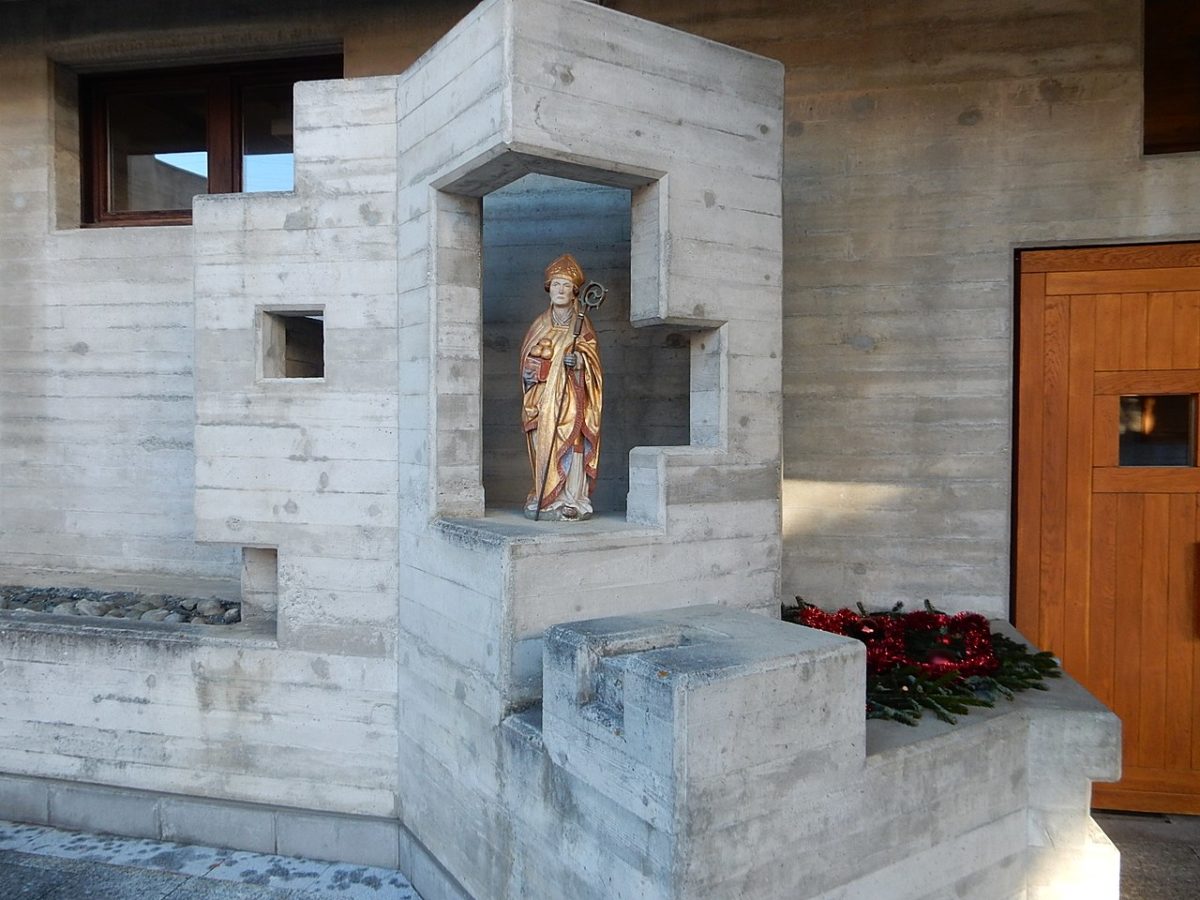 セント・ニコラス教会は、彫刻のようなコンクリート・ブロックのカスケードで造られている。 ほぼ六角形のプランは、精神主義と抽象主義の衝突を目の当たりにし、視覚的な複雑さではゴシック様式の大聖堂に匹敵する空間を作り出している。 村から37メートルの高さにそびえ立つこの教会は、礼拝堂、祭壇、聖具室、洗礼盤、教区民のための座席など、カトリック教会に必要なすべての条件を近代的な環境の中で満たしている。 説教壇、十字架、祭壇は床から生えており、不規則な形の壁は打ちっぱなしの巨大なコンクリートの塊から削り出されている。