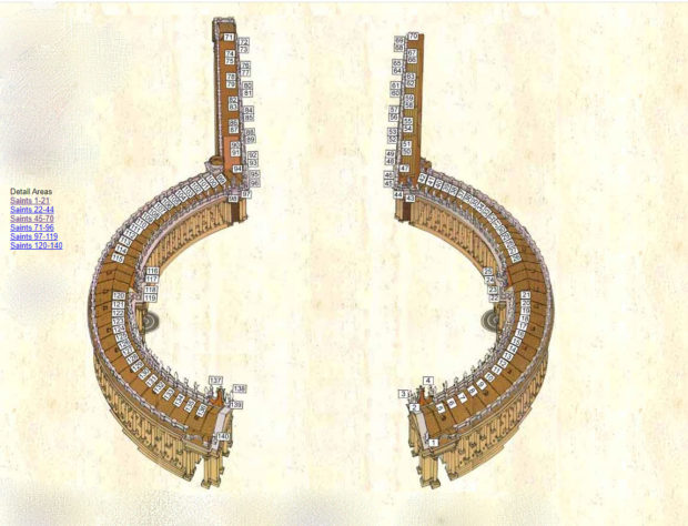 ベルニーニの弟子たちが40年の歳月をかけて彫り上げた高さ3.10メートルの140体の聖人像は、カトリシズムの多くの魂を称えるために造られた。 聖パウロや最初の殉教者ステファノ、修道院の教父である聖ベネディクトや聖アンソニー大王、中世の教会改革者であるアッシジの聖フランシスコや聖ドミニコ、そして “近代的 “なロヨラの聖イグナチオや聖フィリポ・ネリなどである。 ローマ教皇、ローマ帝国時代に亡くなった殉教者、38人の女性もいる。