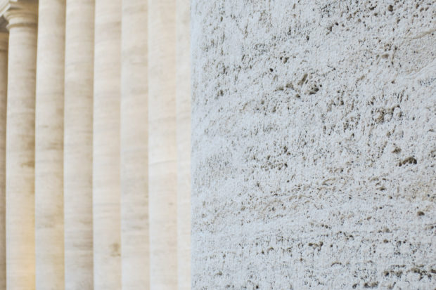 柱の直径は1.5mから始まり、外側に行くにつれて徐々に大きくなり、遠くから見たときのプロポーションの光学的歪みを補正している。 バシリカのファサードは、より近くに見えるように、2本の収束する腕で列柱とつながっている。