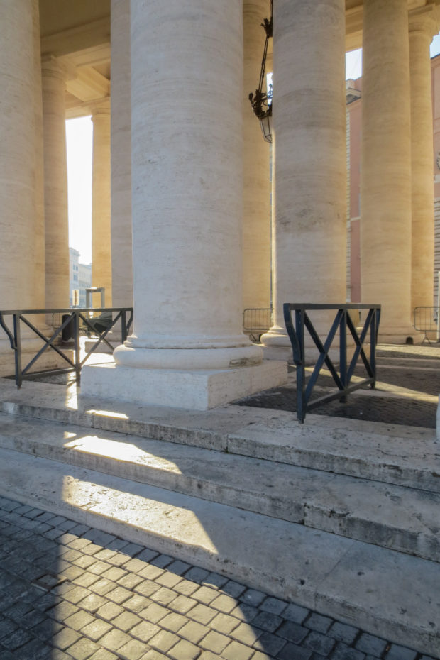 イタリアの ローマにある同名のバシリカの前にあるサン・ピエトロ広場を縁取るベルニーニ作の柱廊。 バチカン市国の一部であり、バチカン市国とイタリアの国境を示す。 床に敷かれたトラバーチンの帯が列柱の両端をつないでいる。