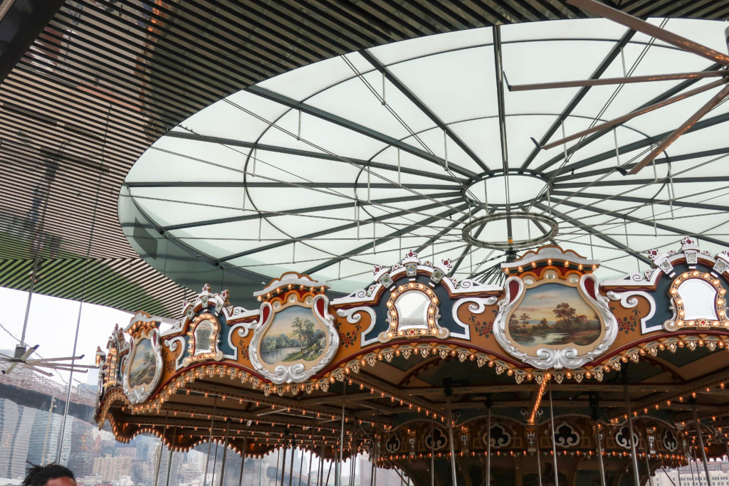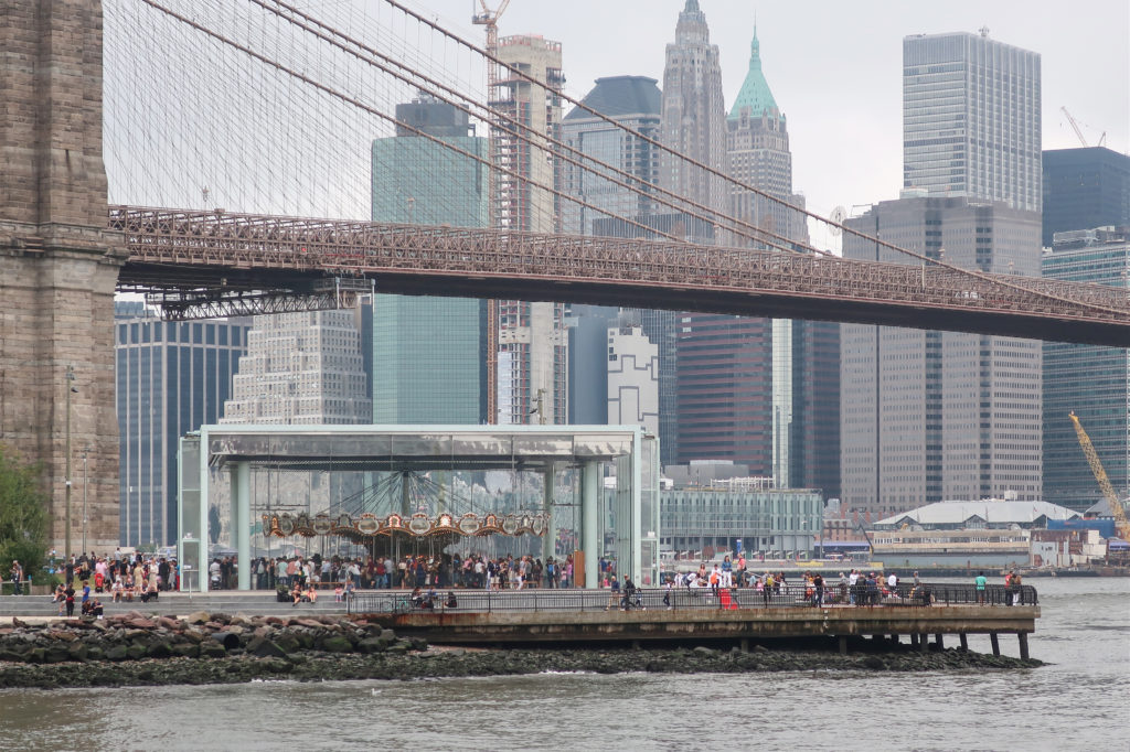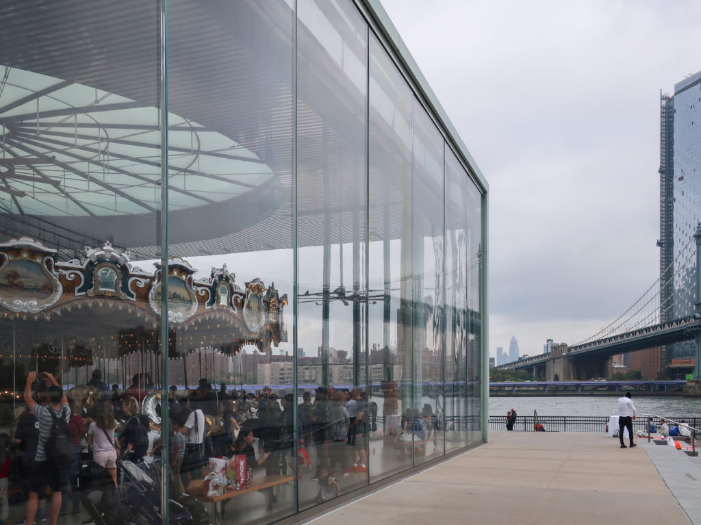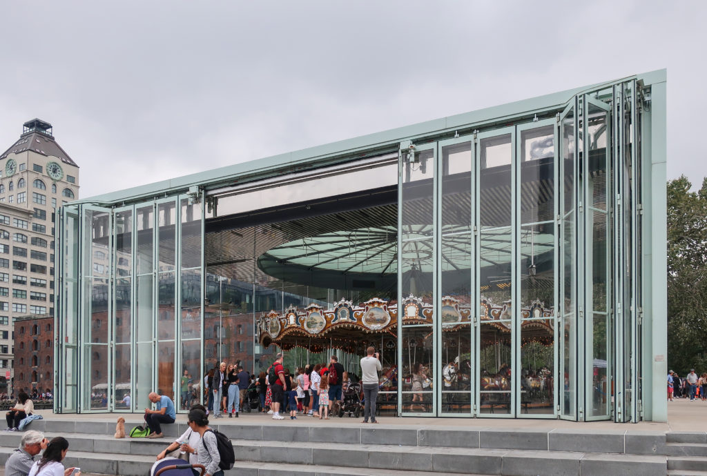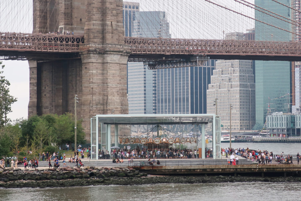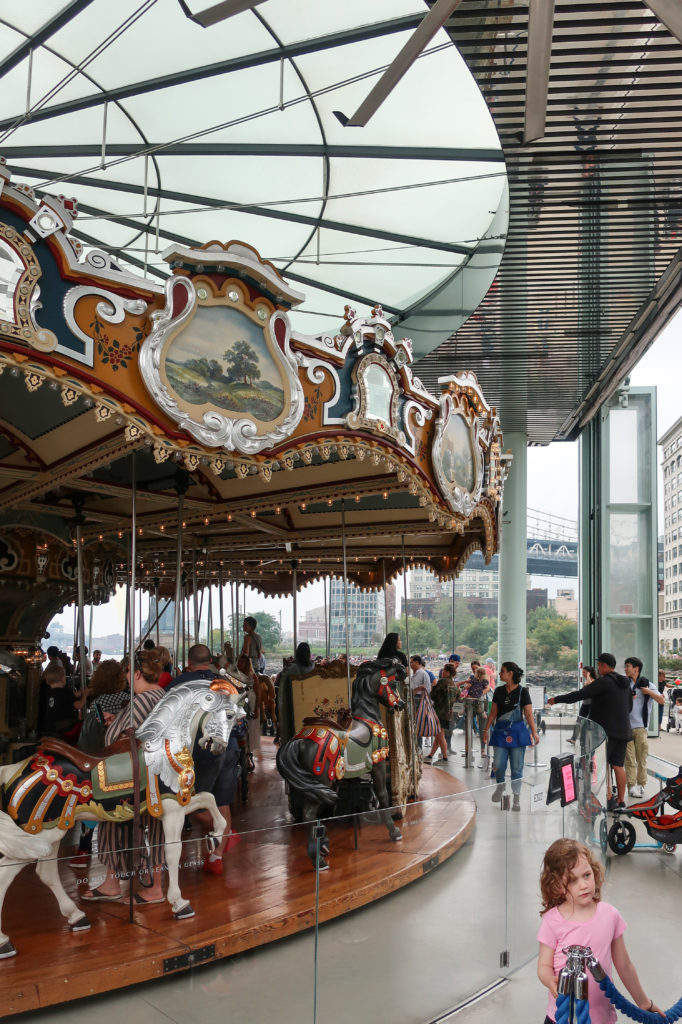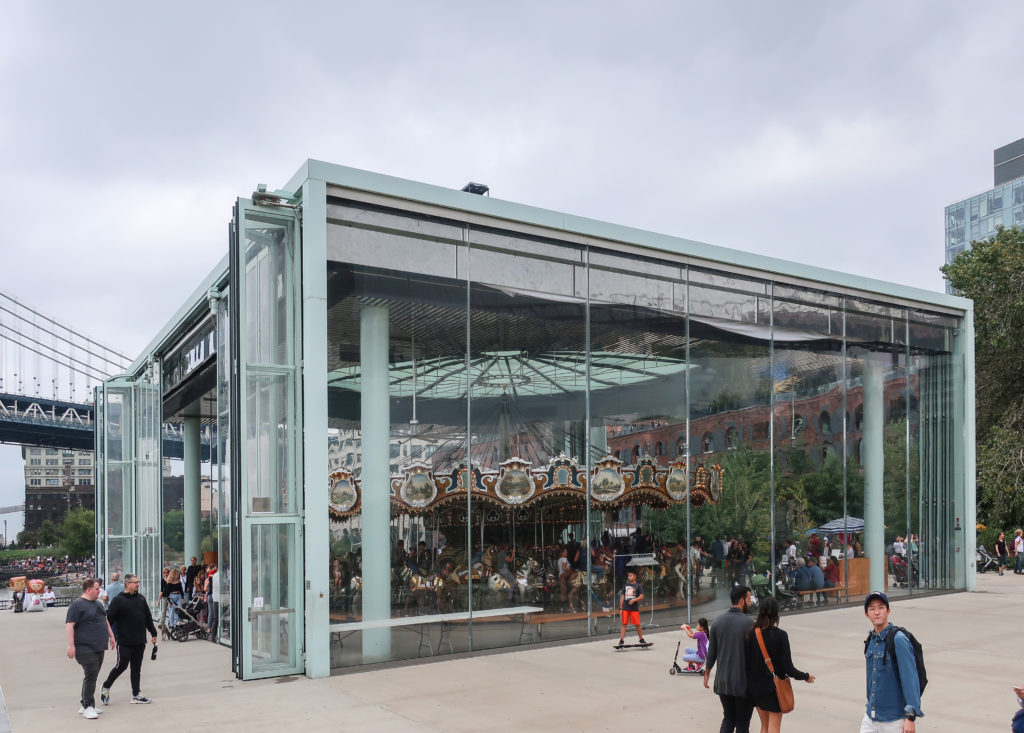 このメリーゴーランドは、ブルックリン・ブリッジ・パークのエンパイア・フルトン・フェリー地区にあり、ブルックリン橋の石畳の桟橋とマンハッタン橋の細い鋼鉄の桟橋の間、イースト・リバーからわずか数メートルのドック・ストリート45番地にある。 ここはDUMBO(ダンボ)と呼ばれ、Down Under The Manhattan Bridge Overpassの略である。