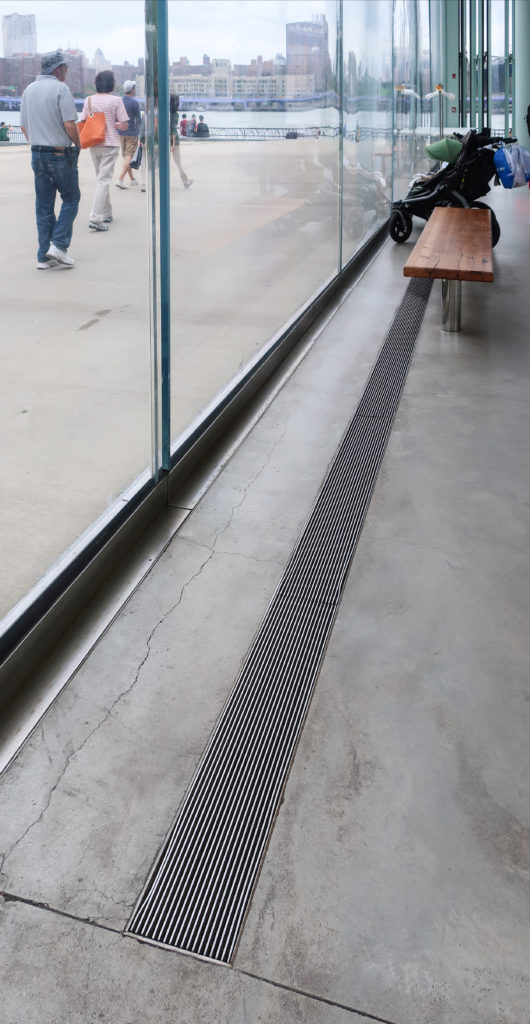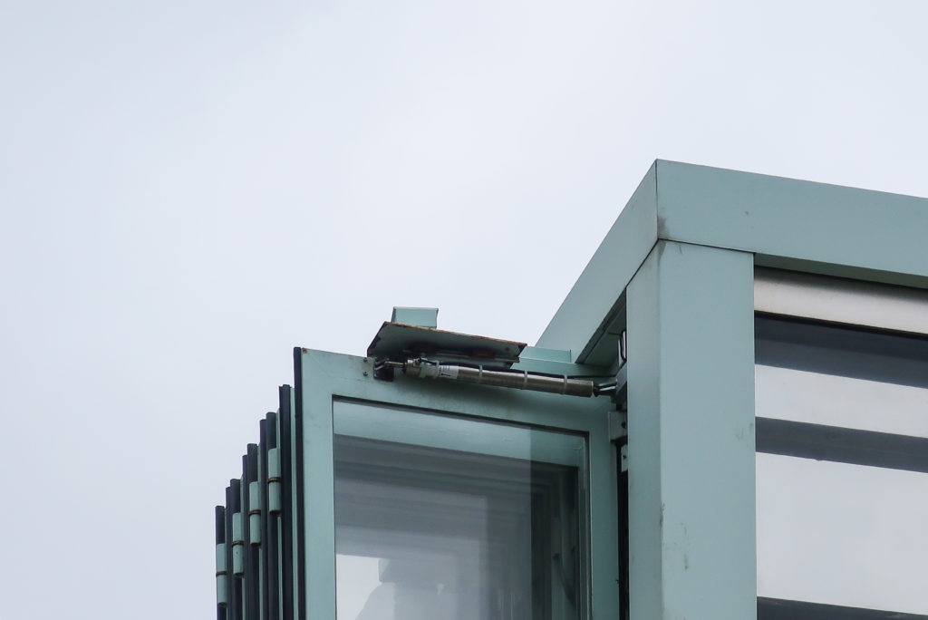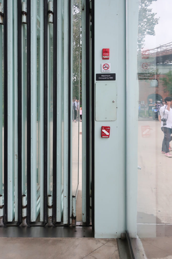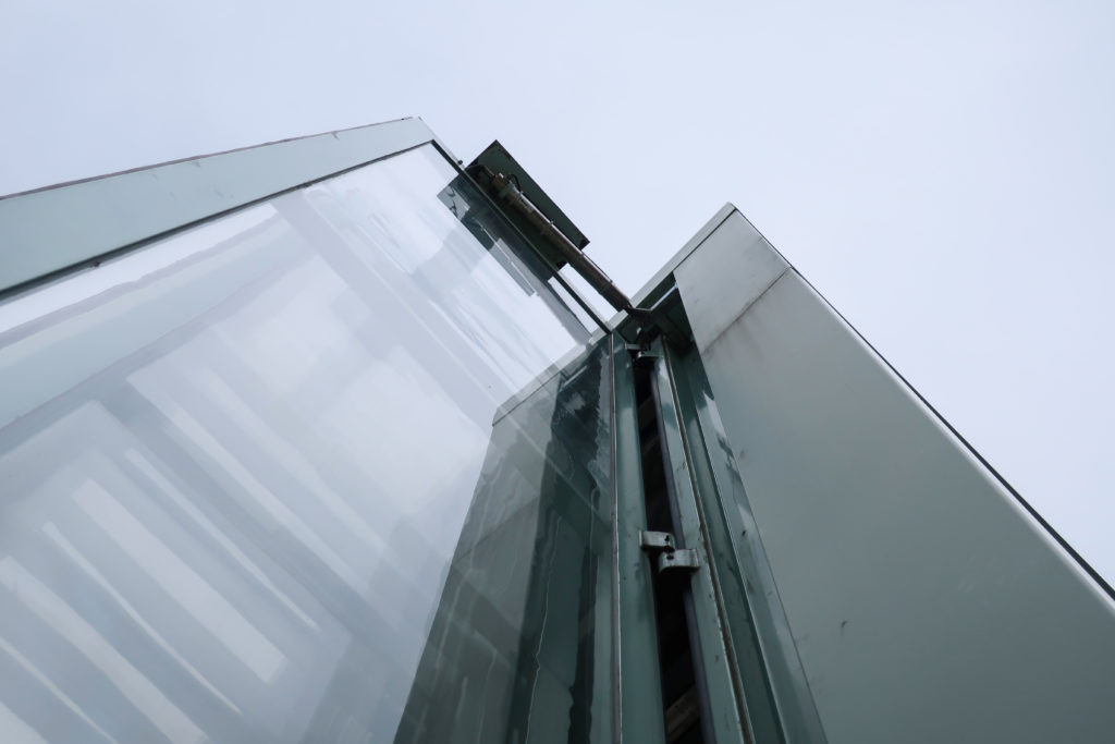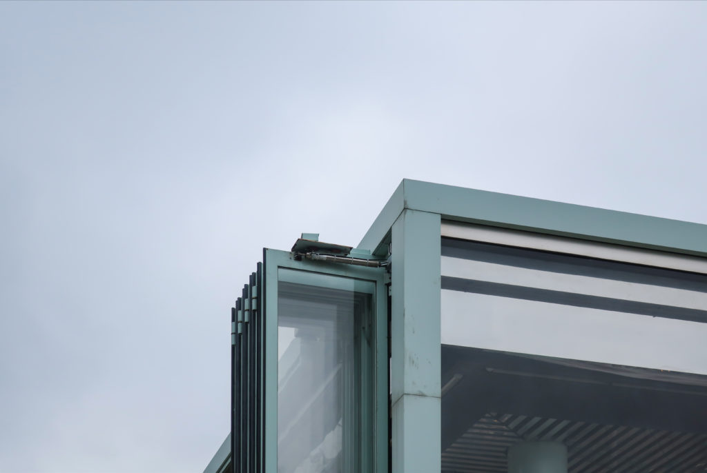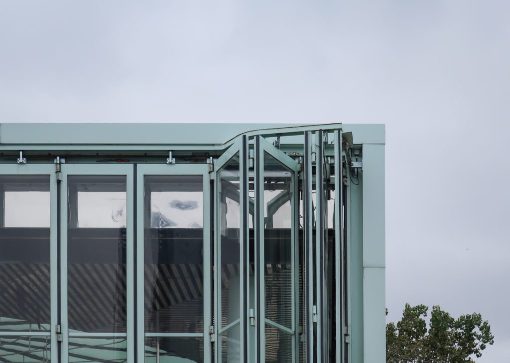建物の4つのファサードはアクリルパネルで構成されている。 東と西のファサードは固定され、完全に透明である。 他の2つのファサードは完全に開閉可能で、公園の北と南にある川をワイドフレームで見渡すことができる。