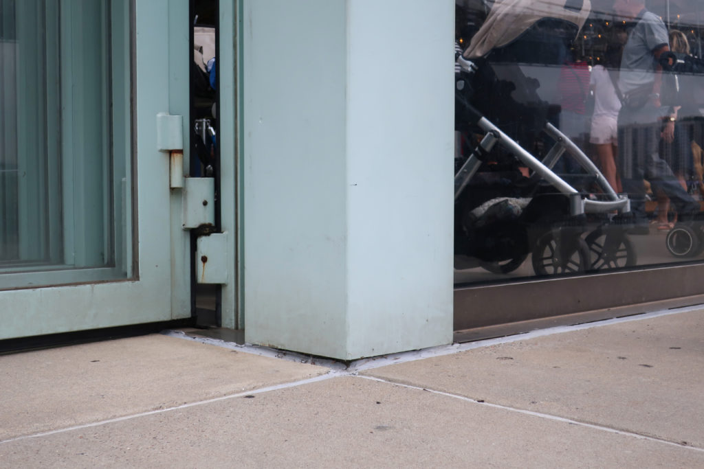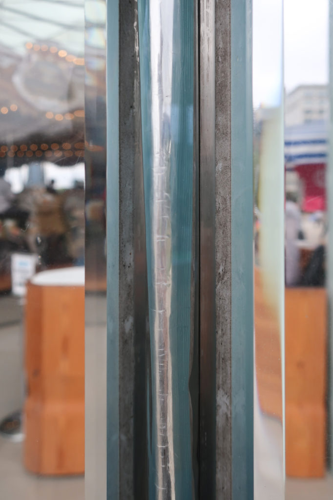固定されたファサードは、厚さ2〜5cm、高さ8.23mの7枚の自立式アクリルパネルで構成され、地面からキャンチレバー状に伸びている。 各パネルは、接合部に折り込まれた金属箔によって次のパネルと分離され、素材が膨張するようになっている。