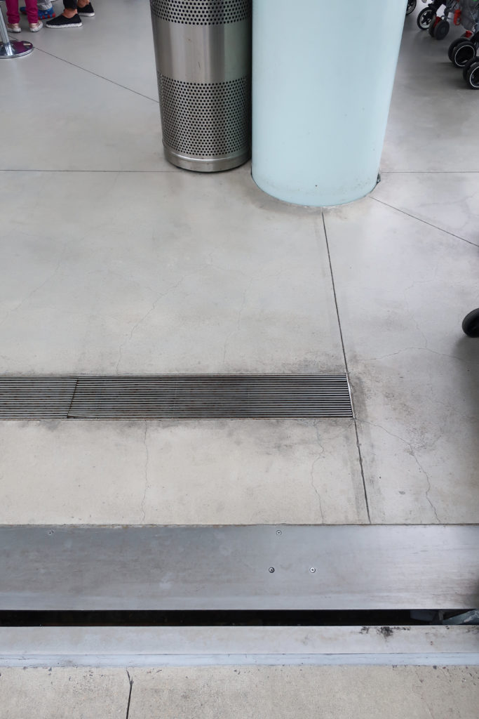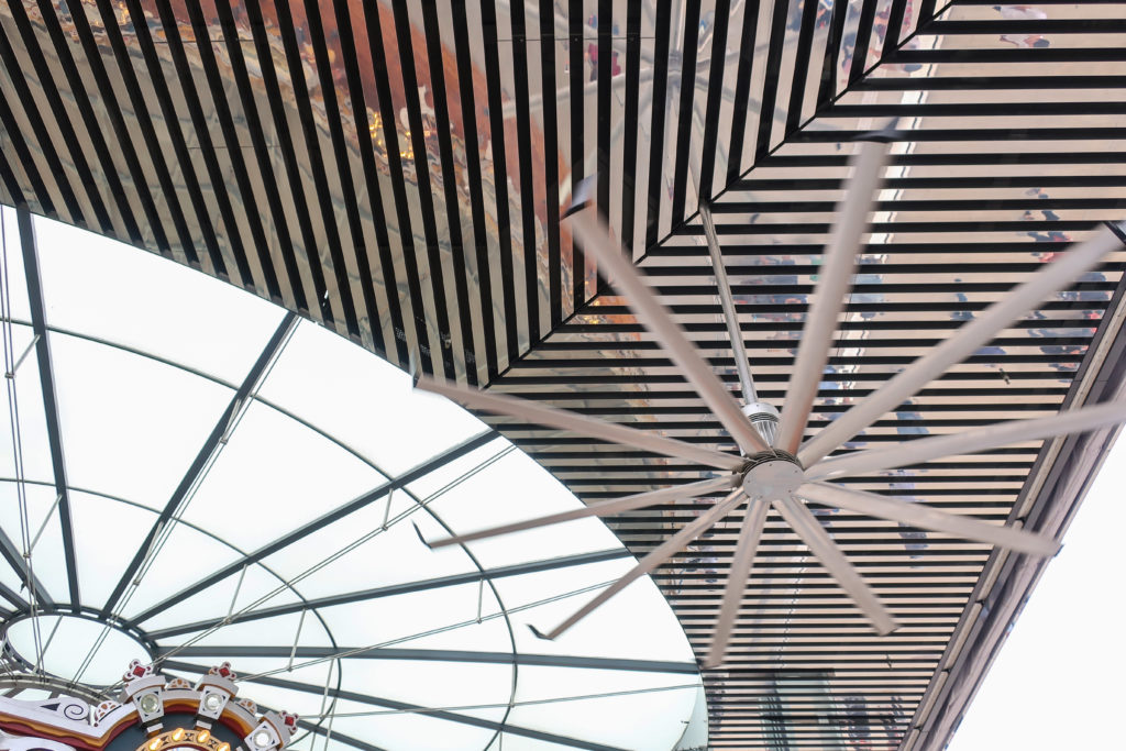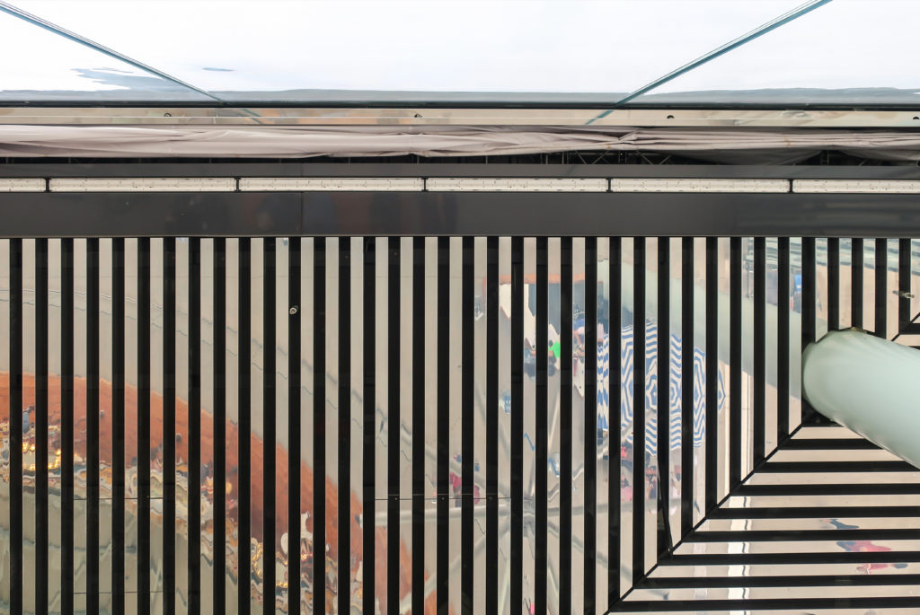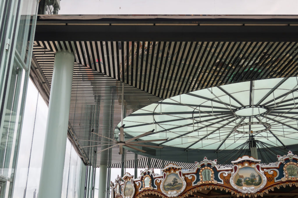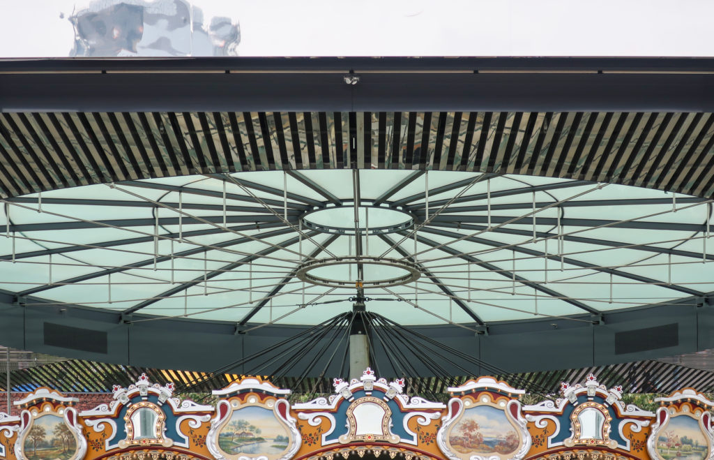 パビリオンの屋根は、幅7.62cmのポリッシュ仕上げのアルミニウム・ストリップで構成されている。 床は磨き上げられたグレーのコンクリート。 カルーセル周辺の制限レーンは、湾曲した強化安全ガラスの手すりによって制限されている。