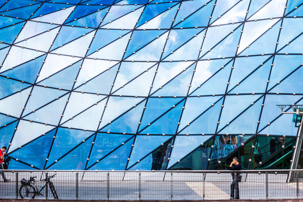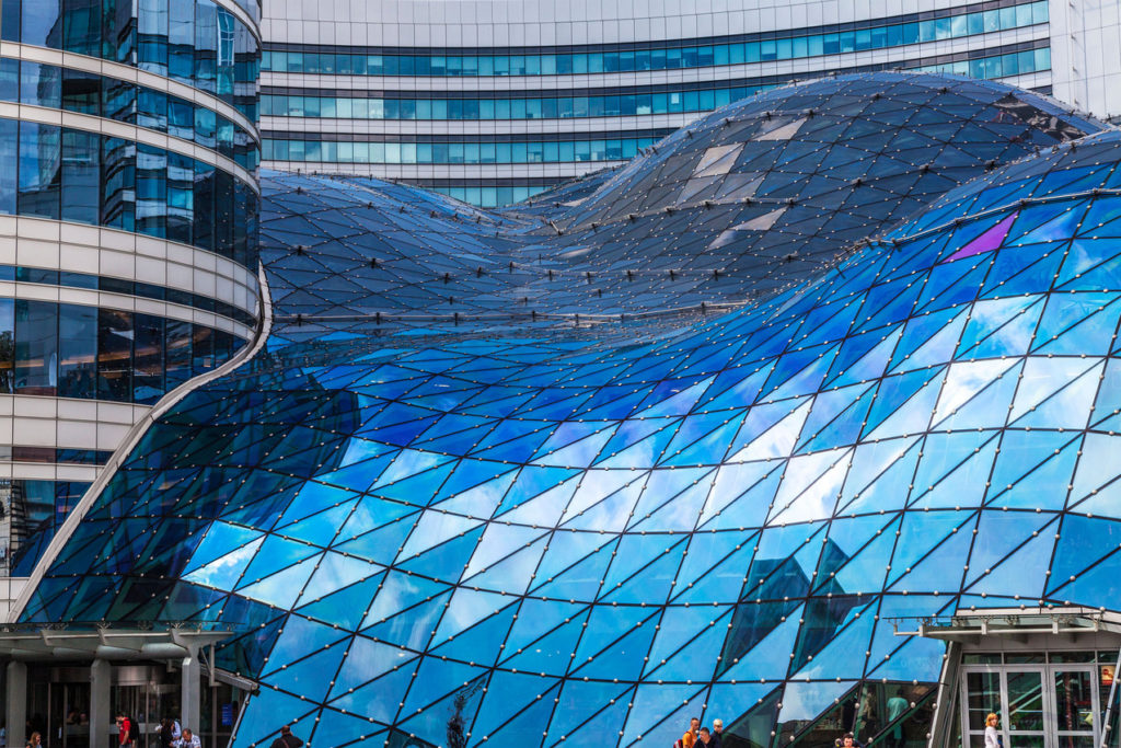 印象的なスチールとガラスの構造体は、いくつかの球体を包む布のような役割を果たし、幾何学的に複雑なグリッドで形成されている。 三角形のガラスパネルは、曲率を形成する上で最大限の柔軟性を提供する。 スチール・ノード技術に基づき、屋根は三角形の断熱ガラス・パネルを支える山状の複雑な溶接部品のネットワークで構成されている。 正面では、屋根が床まで伸び、正面玄関のフレームを形成している。