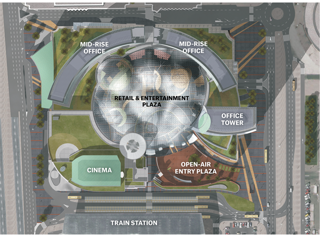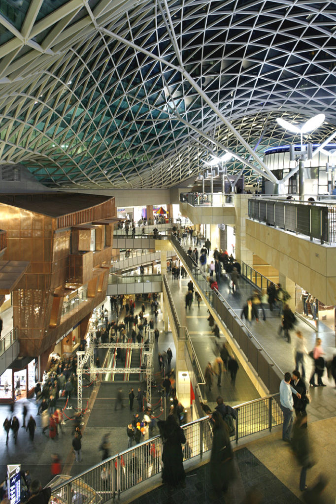デザインの主眼は、中央のアトリウムを囲むように配置された4つの商業フロアで、梢を思わせる波型のガラス屋根が特徴的だ。 キャニオンがアトリウムを掘り下げ、低層階まで光が差し込むようにし、南側の商業エリアとダイニングエリアはカーブしたテラスが連なっている。 その上部の屋根は、サンクン・プラザへと流れ込み、歩行者は2層の駅へとつながる。