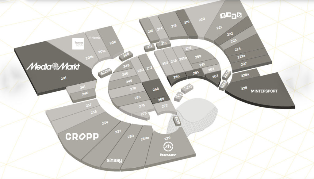 ショッピングセンターの機能的コンテンツは、空間容積ソリューションに従って垂直方向に分配される。 地下の一部と3階から4階までのエリアが通路で結ばれ、独特の雰囲気を醸し出している。