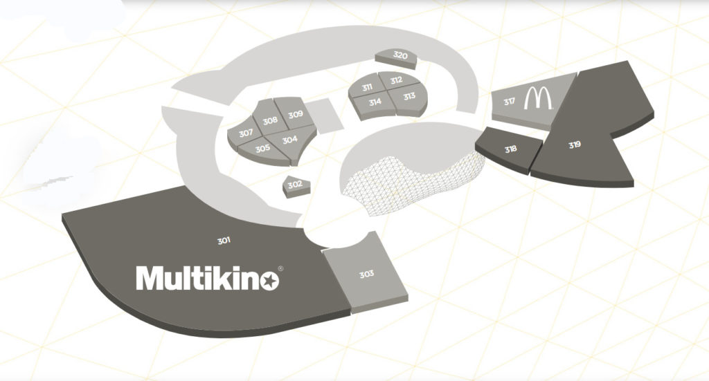 マルチキノ映画館は3フロアを占め、8つのスクリーンを持ち、同時に2560人の観客を収容する。 半円形のホワイエに入ると、赤いネオンが暗闇に散りばめられ、その背景には何百もの銀色のランプが光っている。 部屋の装飾はロバート・マジュクト・デザイン・スタジオが手がけた。