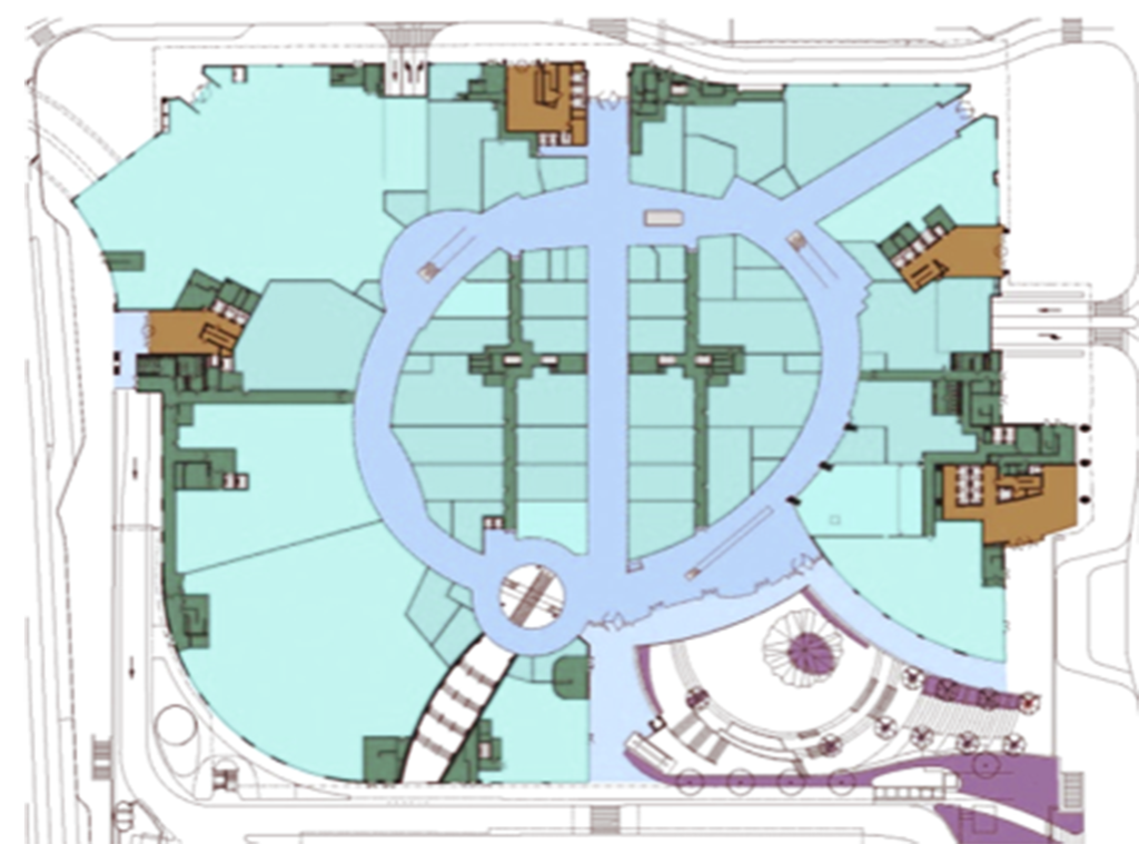 主要動線上の4つの1階垂直コミュニケーションゾーン間の距離は、100m、90m、80m、60m。 モールのトイレは東西2カ所にある。