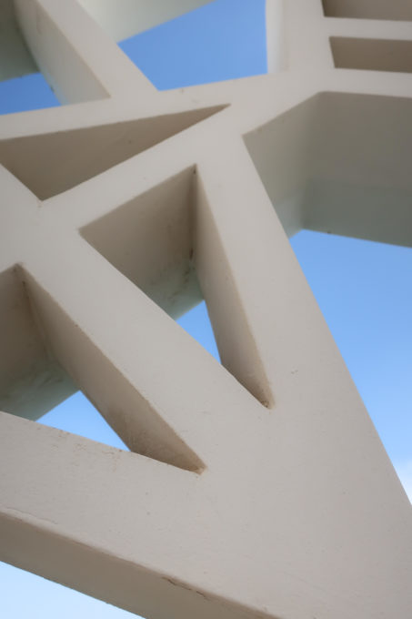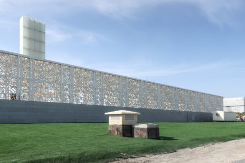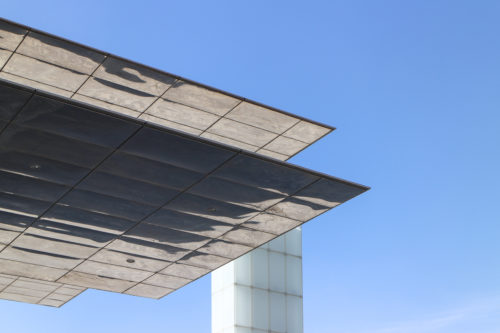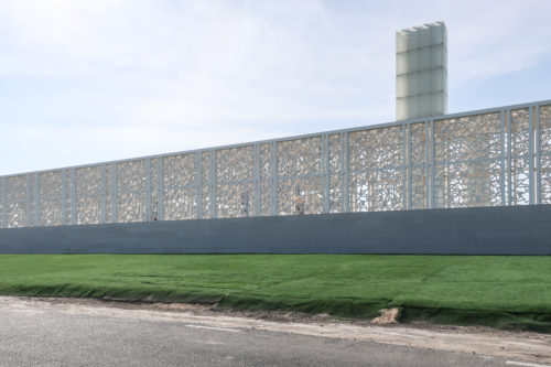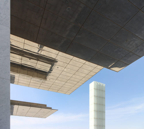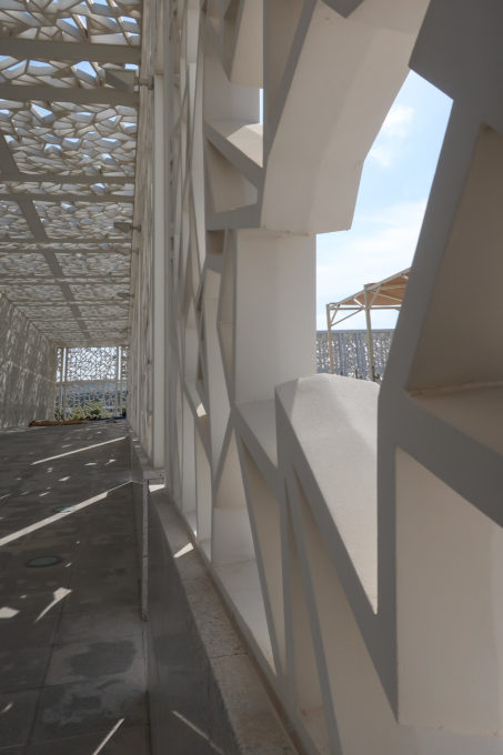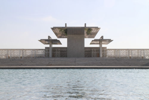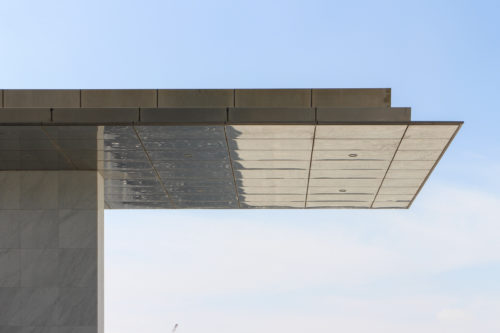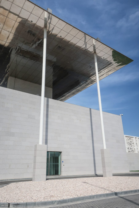 北側へのアクセスは、ヤシの木が生い茂る中庭と、日陰になる2つのサイドギャラリーがあり、階段とスロープでメインエントランスにつながっている。 中央の舞台へと続く2つの広い階段の前には反射池があり、舞台は3つの平らな面によって保護されている。 側面の屋根はそれぞれ耐力壁で支えられており、南北方向に配置されているため、見る者は屋根の幅が狭いと感じ、その軽さが強調される。 対照的に、中央の天井を支える壁は最初の2つと垂直に配置され、舞台の「背景」として機能する。 中央の天井は3つの中で最も大きく、壁の後ろに隠れた2本の小さな柱で支えられている。