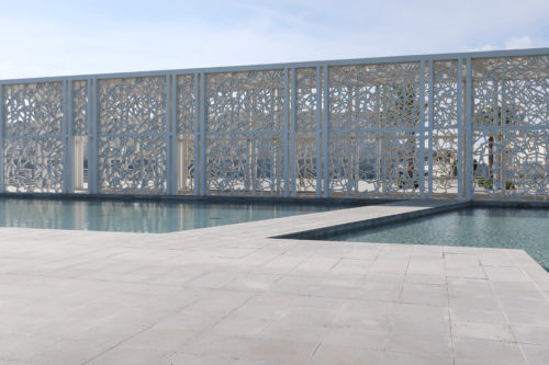 セレモニアルコートは、3mの高低差のある2つの中庭で構成され、三方を日陰のパーゴラで仕切られている。
