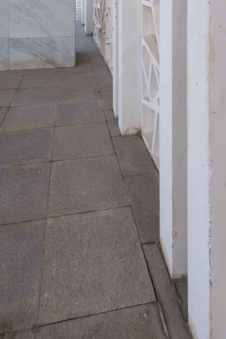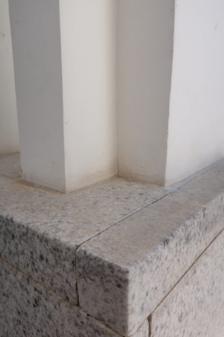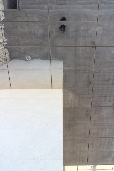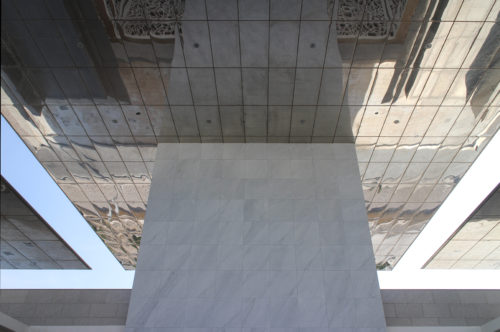 中央の基壇の上にそびえる3つの壁は、大理石のスラブで覆われ、下部が鏡のスラブで覆われた天井を支えている。