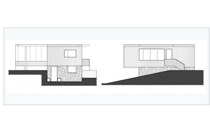 ブロイヤーは、地形の凹凸を利用し、地面に固定された石の箱と、その上に2.5mの張り出しで、北と西を向いた長方形の木の箱を配置することで、敷地近くの川の氾濫の可能性を回避している。 西側では、ブロイヤーがスケッチに記したように、木製の箱が石壁の上をスライドし、見晴らしの良い方に向かって宙吊りになっている。