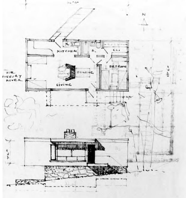 キャビンが建てられた9haの土地は、アメリカ・マサチューセッツ州ウェイランドの郊外、サドベリー川のほとりに位置し、グレート・メドウズ国立野生生物保護区の雄大な景色を眺めることができる。