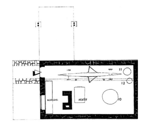 コテージには2つの独立した入り口があり、ギャラリーからも出入りできる。 下部の西向きの出入り口は、2つの低い石壁で囲まれている。 角の一角に置かれ、小さな窓が添えられている。 1階にはカヌーを置くスペースがあり、暖炉は上階のものと連続している。