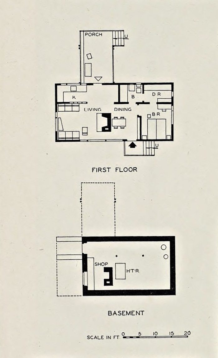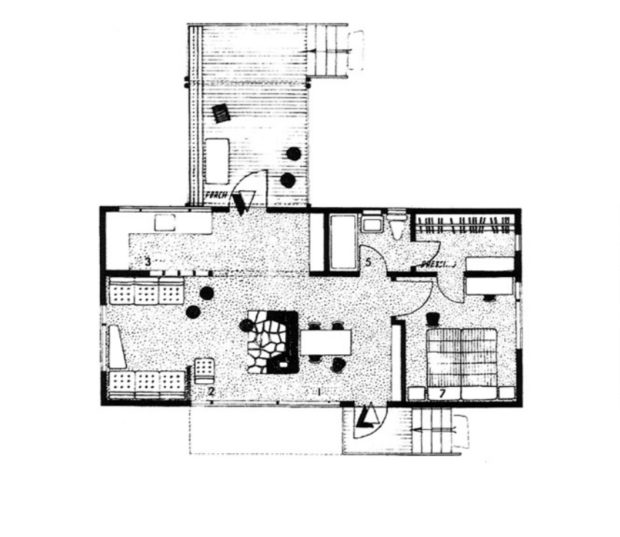 一方はリビングルームに、もう一方はギャラリーに面しているキッチン、洗面所、ドレッシングルームは狭いエリアにある。 ダイニングルームとベッドルームは最も広い部分にある。 ブロイヤーの作品において、自由な要素、この場合は暖炉が室内に登場するのはこれが初めてである。 暖炉の近くには木と石の床が並んでいる。