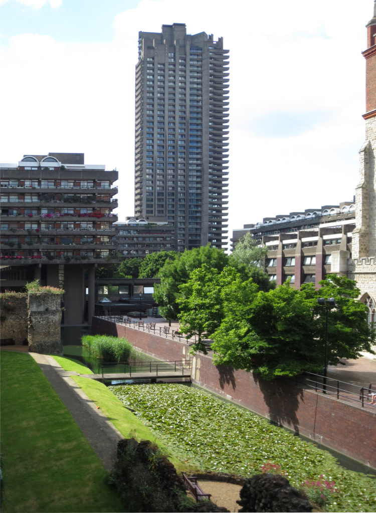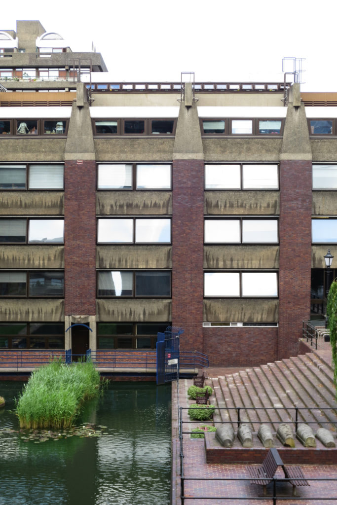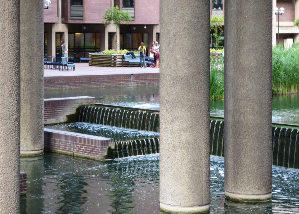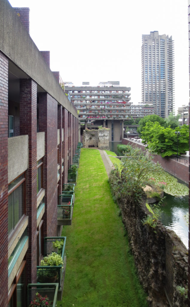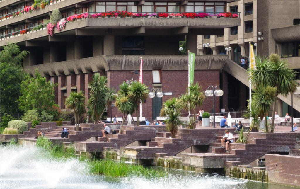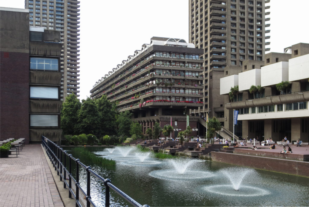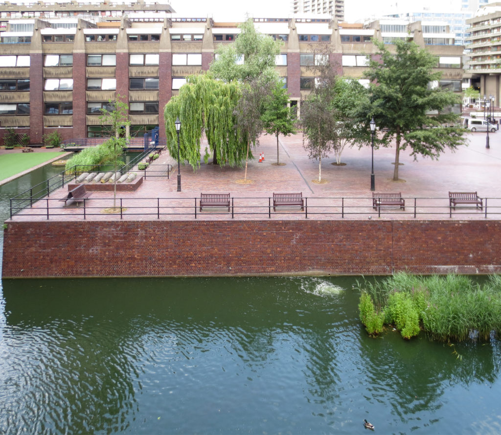 建物の下に広がる舗装されたテラスの連続性や、植栽や水辺がオープンスペースを繋ぎ、定義していることは、アンサンブルの統一性に大きく貢献している。 バービカンの南側にある建物の長いテラスに囲まれた主要なオープンスペースは、イギリスの首都の公園や広場でおなじみのように、芝生、森の木々、水の造園で壮大なスケールでレイアウトされている。