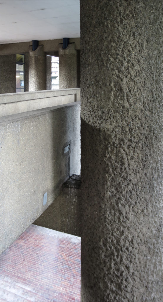 計画のさまざまな段階を通じて、バービカンの外観はさまざまな可能性を持っていた。 当初、チェンバリン、パウエル、ボンは、バービカンを隣接するゴールデン・レーン団地の設計に似せたものにするつもりだった。 1959年の報告書では、建築家たちはブロックのテラスを白い大理石で覆い、塔は高度に磨き上げられたコンクリートで、柱は滑らかなカラー・コンクリートで仕上げるというプランを描いている。 バルコニーをモザイクで覆うという提案もあった。 この豪華で高価な素材の選択はロンドン市によって却下され、より経済的だが労働集約的な打ち放しコンクリート仕上げが採用された。 このクラッディングによって得られた外観は、この巨人的プロジェクトの顕著な特徴のひとつとなった。 すべての建物の表面で均一な外観を得るために、壁はハンマーで叩かなければならなかった。 コンクリートが完全に乾くまでは作業ができないため、ピックで打ち付けた。