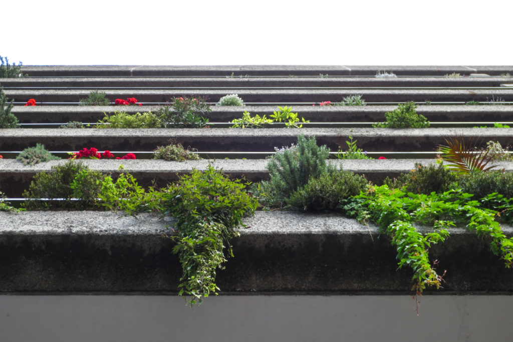 テラス棟は、耐力壁と鉄筋コンクリートの床スラブというシンプルな構造で、梁はバルコニーの端まで伸びている。 この建築方式が採用されたのは、多くのフラットに壁一面または床から天井までの窓を設けることができるからだ。
