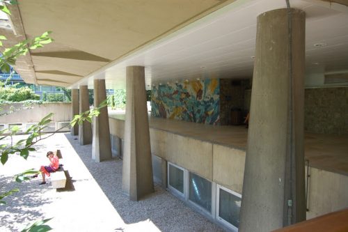 事務局と会議棟の間にある砂利敷きの中庭には、2つの独立した壁が直角をなすように立てられ、人目を引く陶器で覆われている。 これらは「昼と夜」を表し、2人のスペイン人画家、ジョアン・ミロとホセ・ロレンス=アルティガスの作品である。 ミロとロレンス=アルティガスはスペインでこれらの作品を制作し、大小585点の作品を描き、配置した。 その後、壁画は梱包され、パリに運ばれた。