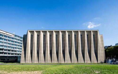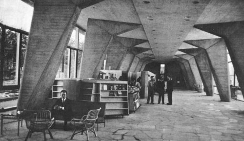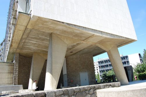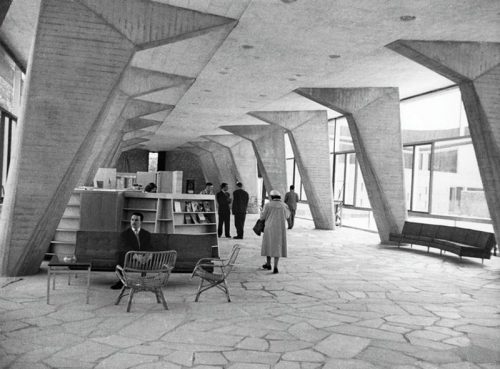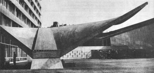 鉄筋コンクリートは柱とベース構造の両方に使用され、すべての柱の建設に使用されたのは4本の曲木型枠のみであった。 コンクリートの可塑性は、構造の選択に重要な役割を果たすだけでなく、より大きな自由を可能にする。 側壁と波型の屋根を持つユネスコ会議の建物は、この素材を装飾的に利用した印象的な例である。 屋根の高さは一端が12m、もう一端が14mで、中央は9.75mまで傾斜しており、6本の柱で支えられている。