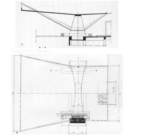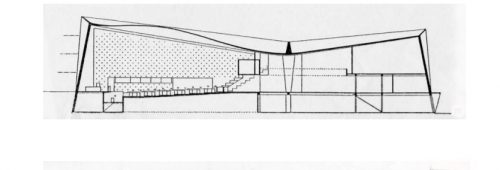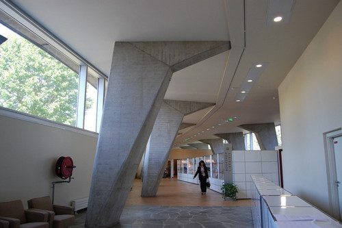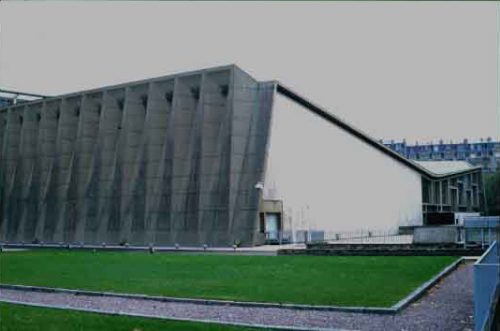 会議棟建設時に直面した主な問題は音響だった。 この素材は可塑性があるため、高さの異なる壁に複雑なアングルと再入角を作ることができ、その上に左右非対称の2層天井の両端がコンクリート柱の列の中央に載っている。