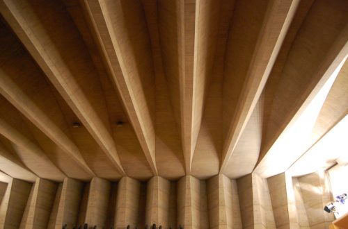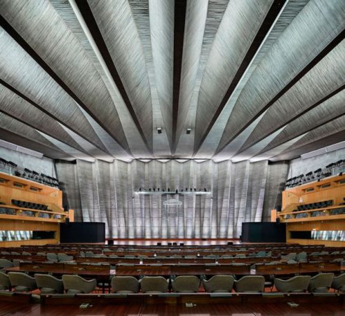 アッセンブリーホールは、台形型の間取りで、コンクリート屋根の上に壁を載せた耐力構造になっている。 構造全体には開口部がなく、35cmの折りたたみスラット状の壁は、安定性を高め、開放的な大空間に必要な厚みを減らすだけでなく、天井の静的応力に抵抗し、音響機能をカバーする。