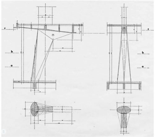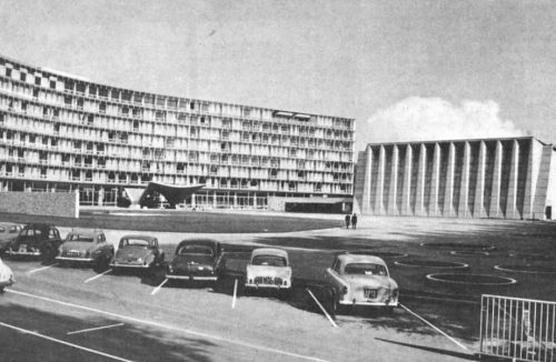 スリーポインテッド・スター」の愛称で呼ばれるこの建物は、高さ7メートルの傾斜した72本のコンクリート杭の上に建っている。 元々、柱と柱の間にできた部分はすべてガラス張りだった。 杭の上には楕円形の土台が載っており、その長軸は建物と平行に走り、その上に1階スラブを含むブロックと直角に非常に細長い長方形が聳えている。 このような要素の配置は、コンクリート構造のような曲げによって機能する構造に対応するものだが、この場合、当時の美的理由にも対応するものである。 3つの建物とも、素材の経済性を追求した結果、複雑な形になっている。 事務局ビルの主要な金属製の梁は、その両端が荷重の落差を表現する勾配になっている。 オフィスの片持ち梁面も同様に支持スラブの厚みを減らしているため、これらの部屋の屋根は水平ではなく、上向きに傾斜しており、ファサードのガラス面の効果を高めている。