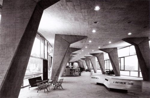最も長いファサードの入口前に置かれた大きなコンクリートのポルティコの形は、かつて修道女の信徒たちが身に着けていた翼のあるコイフを思わせる。 長さは15.24メートルで、建設には100トン以上のコンクリートが使われた。 ファサード全体を支配するこの建物は、当時の工学の勝利であり、それ自体が彫刻作品に近いと考えられてきた。