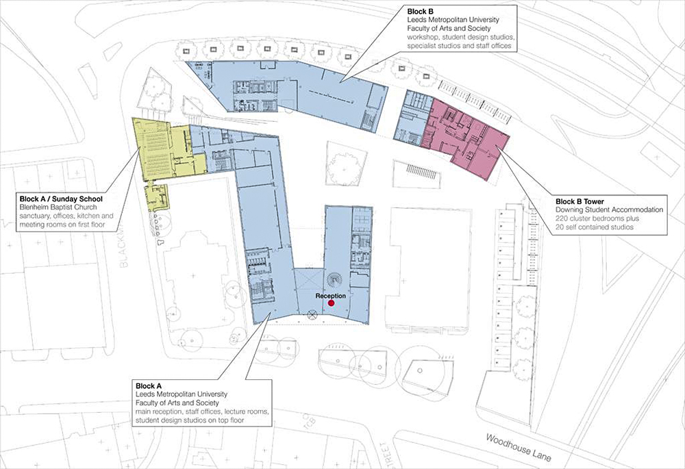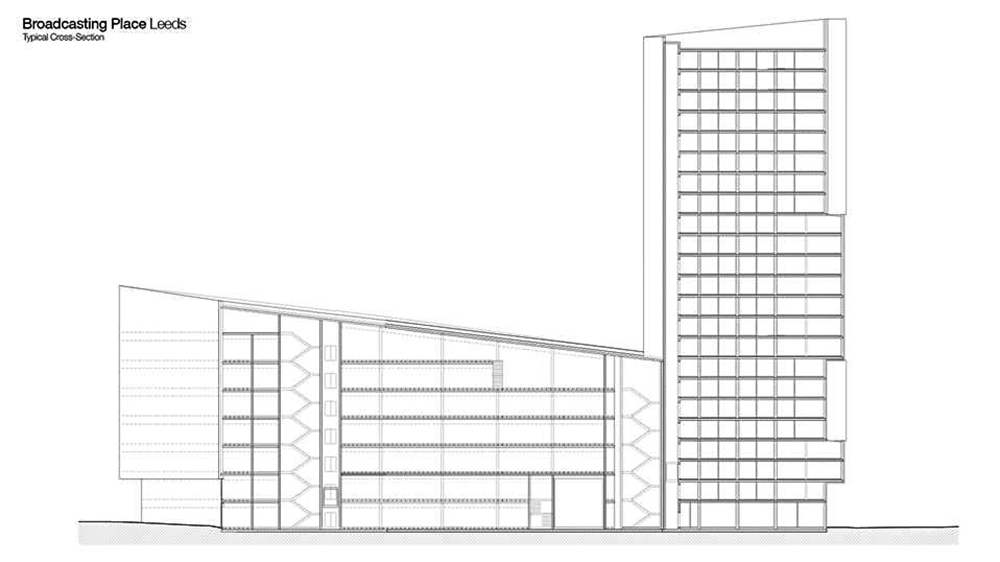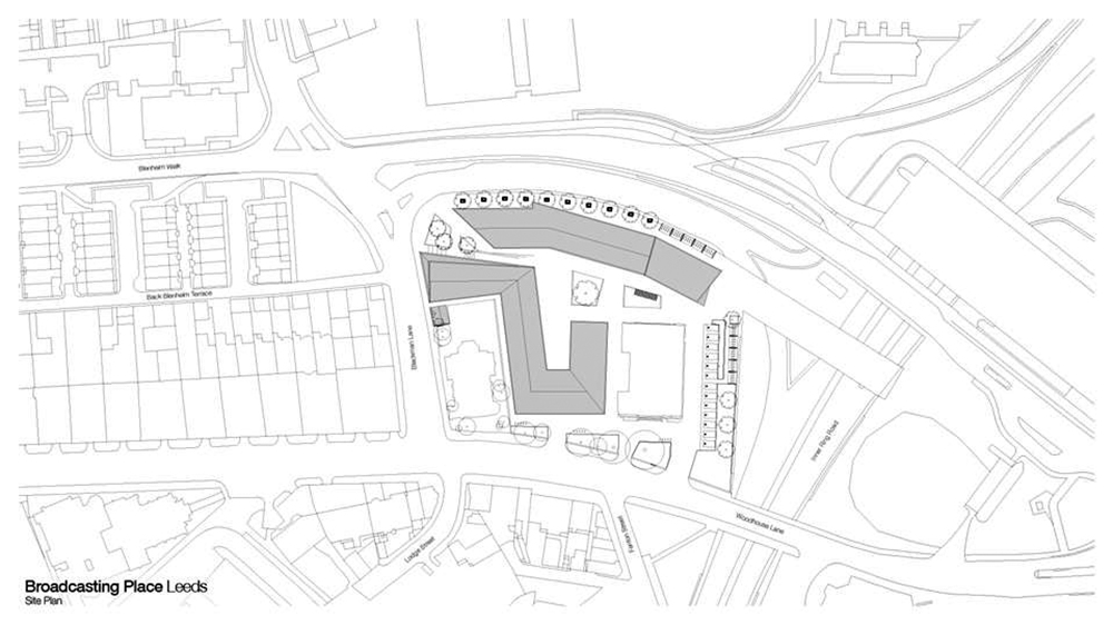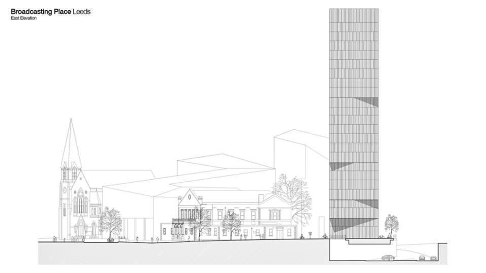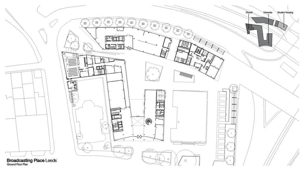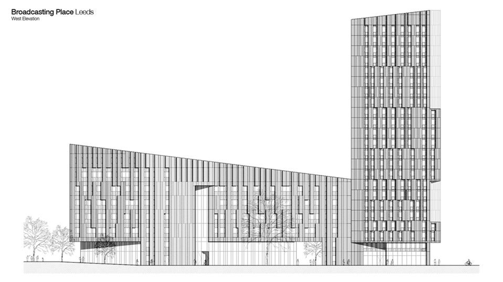 ブロードキャスティング・プレイスは、リーズ市の中心部に近い印象的な複合施設である。 ダウニング・プロパティ・グループとリーズ・ベケット大学の官民パートナーシップにより、23階建てのランドマーク的な建物に、約10219m2の新しいオフィスと教育スペース、240戸の学生寮が提供される。 新しいバプティスト教会がこの計画を完成させた。