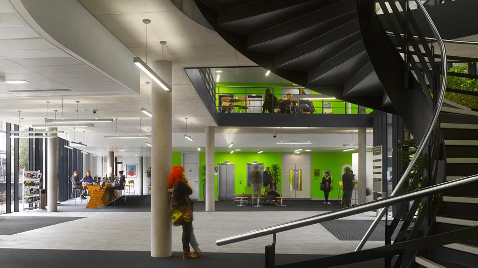 一方、リード・メトロポリタン大学のメインエントランスはウッドハウスレーンに面しており、講義室、セミナールーム、オフィス、共用ホワイエが3階から6階まである。